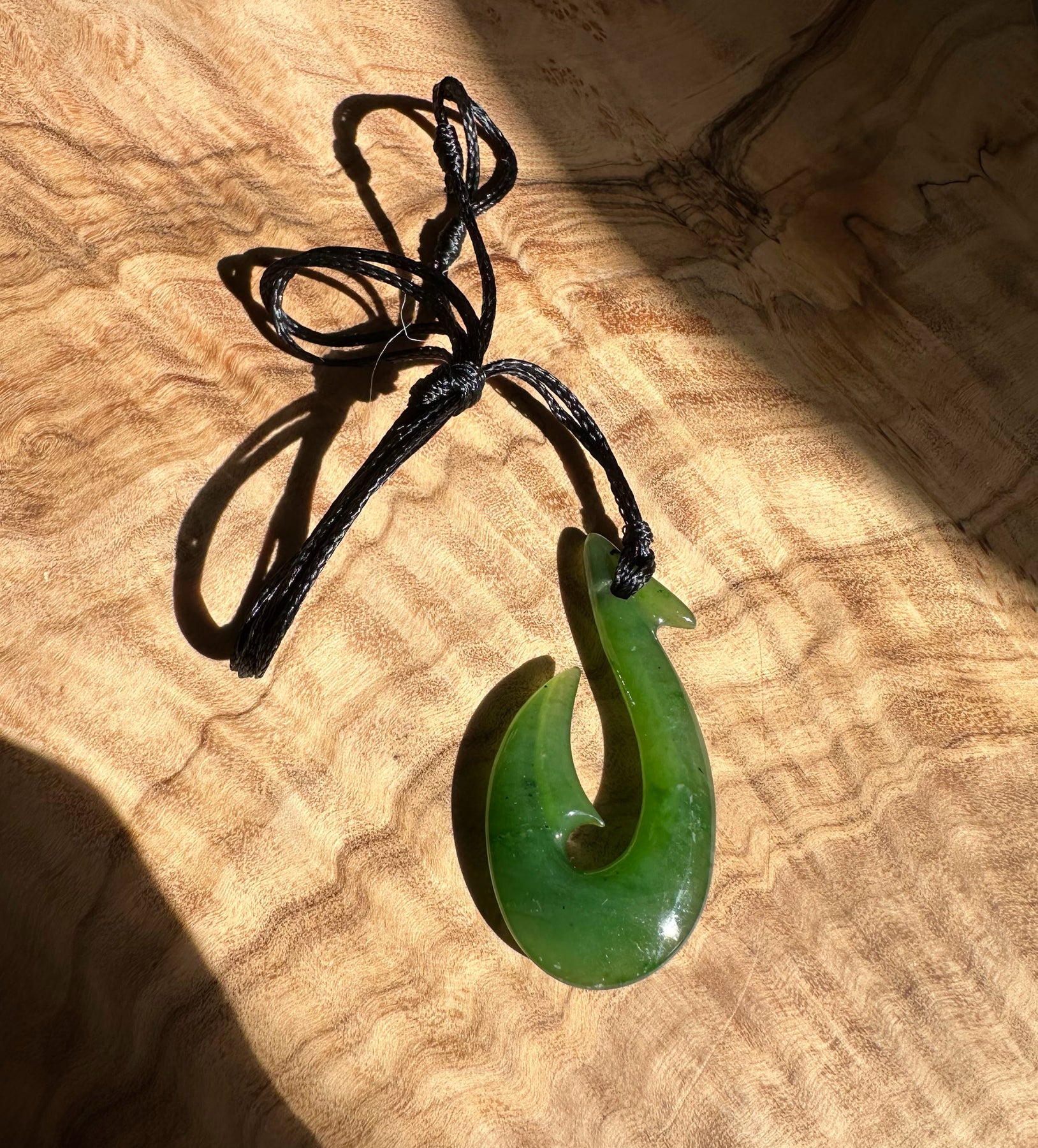 This exquisite Canadian jade fish hook pendant embodies the Hei Matau symbol, traditionally associated with strength, determination, and safe passage.