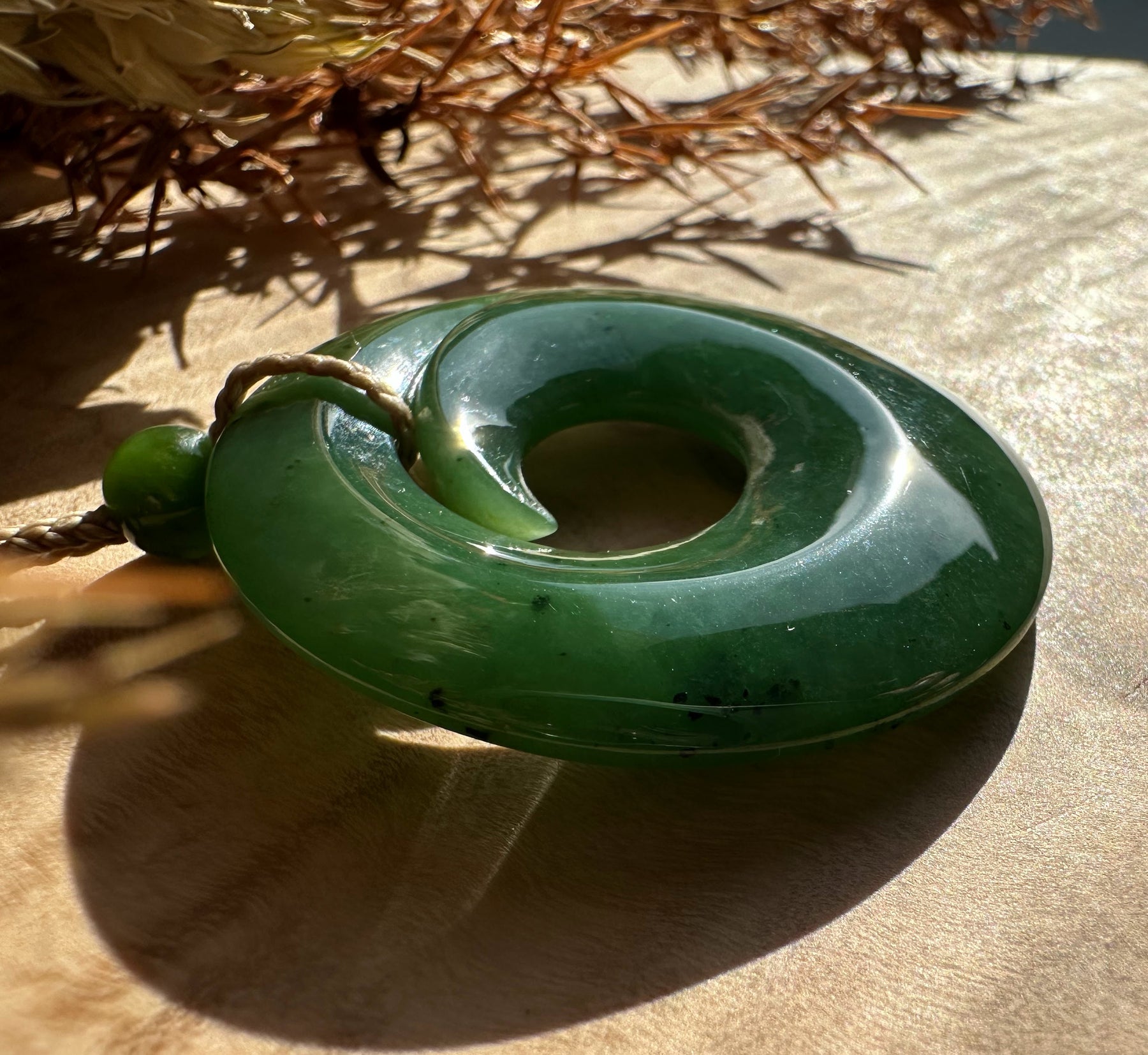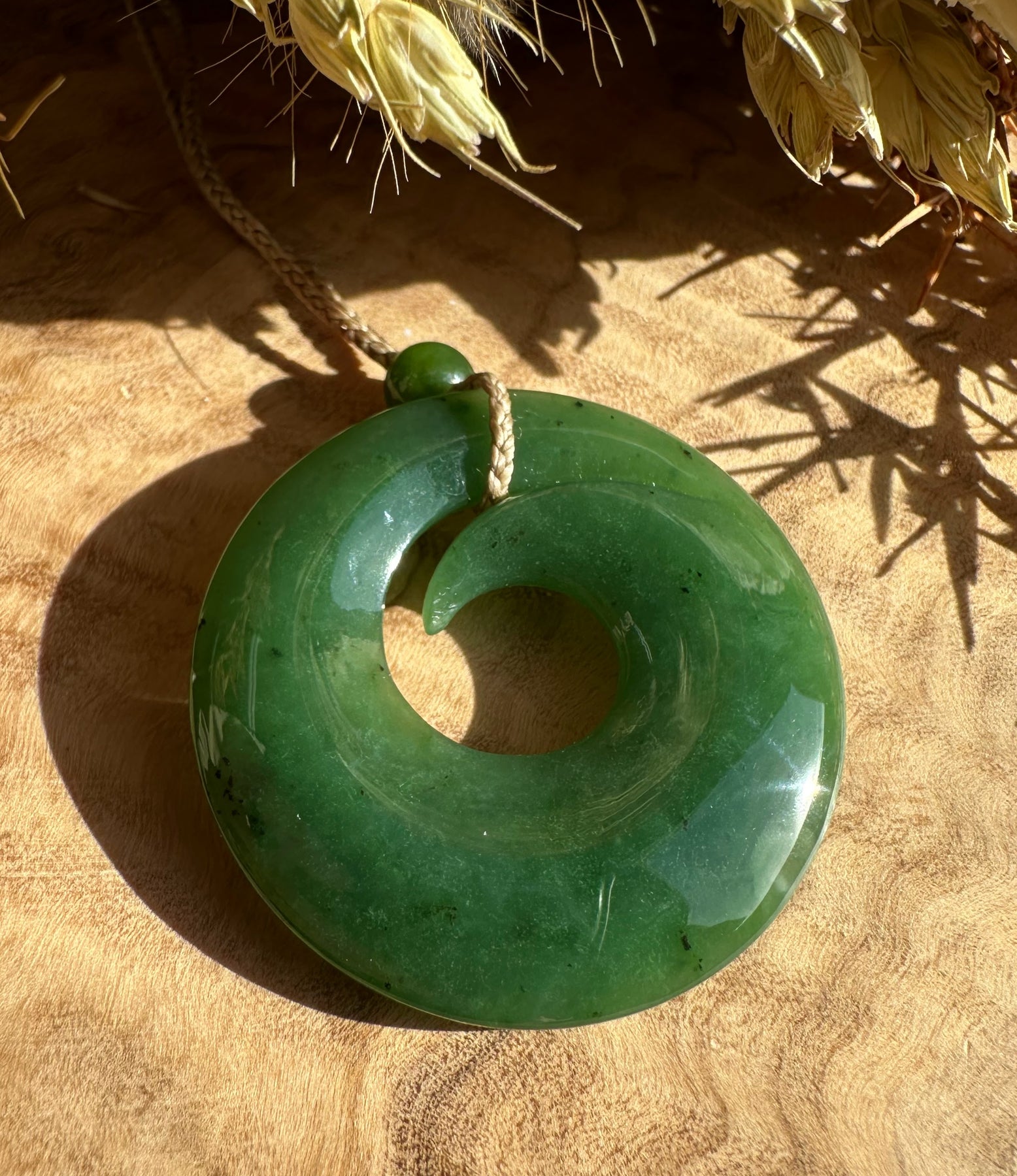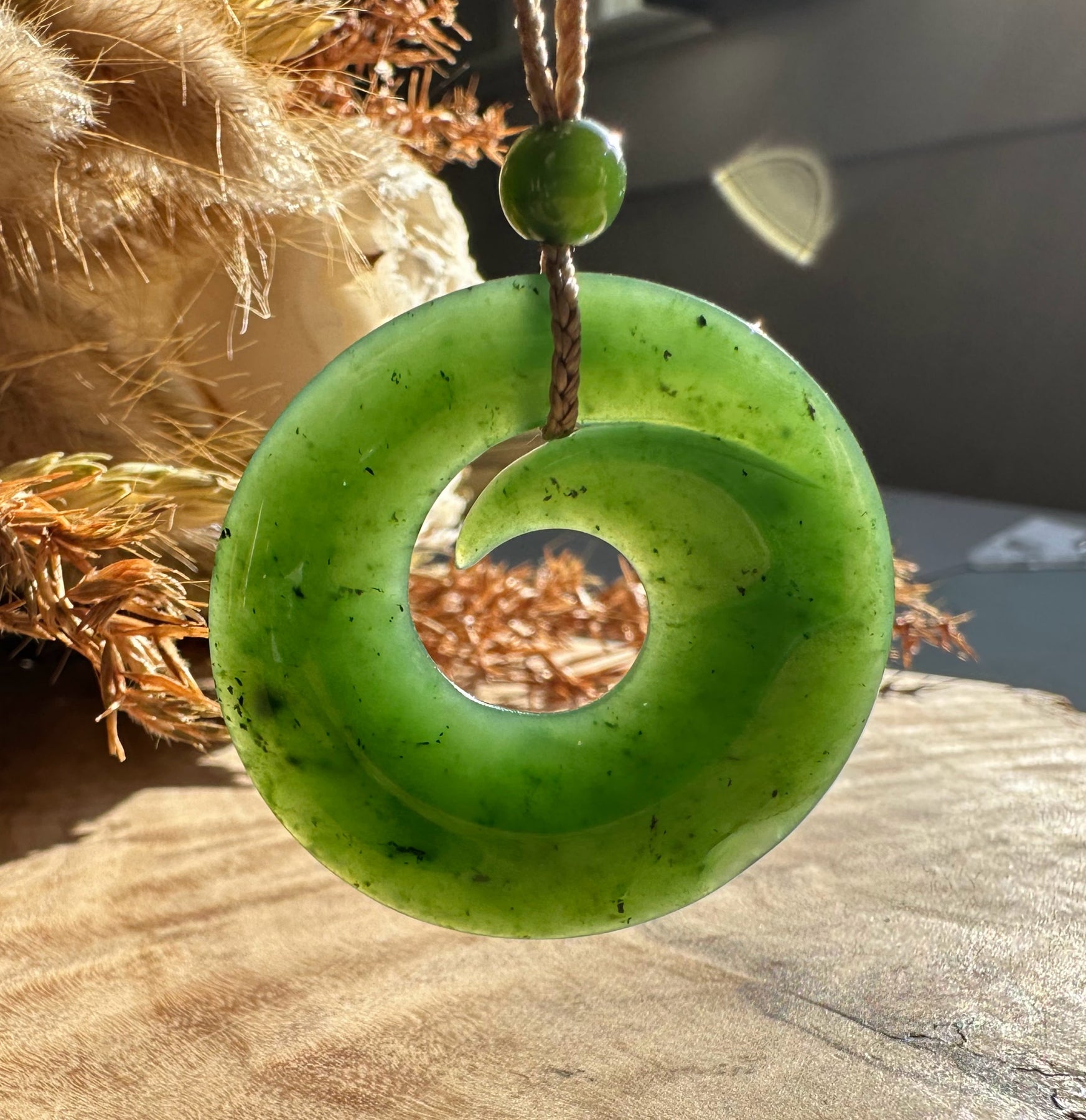 Maori Styled Pendant carved out of solid natural untreated jade. A striking Jade Pendant. Inspired by Maori designs. Threaded on a braided waxed cord, comes complete with or without our Hand Crafted Wooden Display Box.