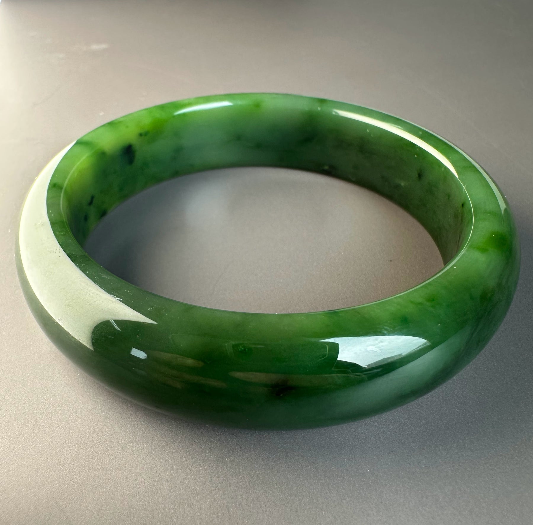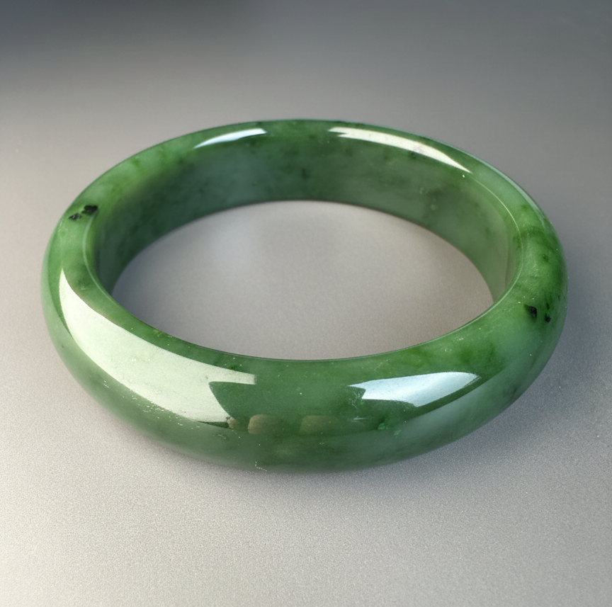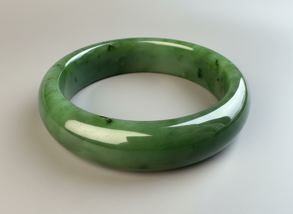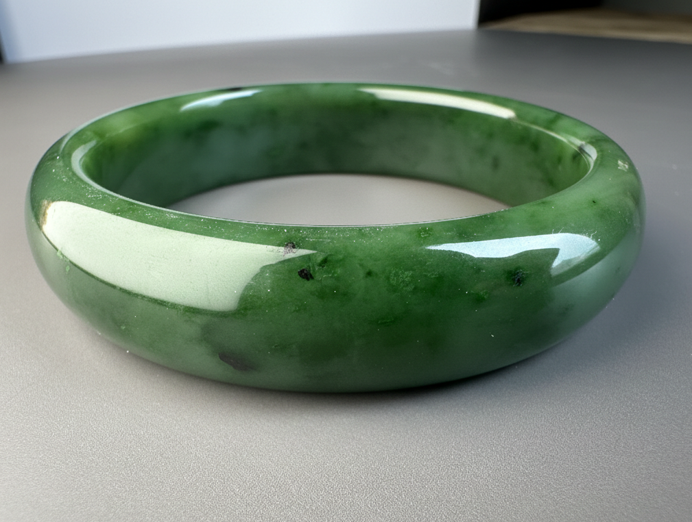 This authentic Canadian Nephrite Jade bangle showcases the natural beauty of jade sourced from Northern British Columbia, near our Kutcho Creek Deposit. Measuring approximately 58 x 15.5mm, this A Grade piece features the rich character and durability jade is known for. Please note this bangle has a small chip that doesn't compromise its structural integrity—it's offered AS-IS