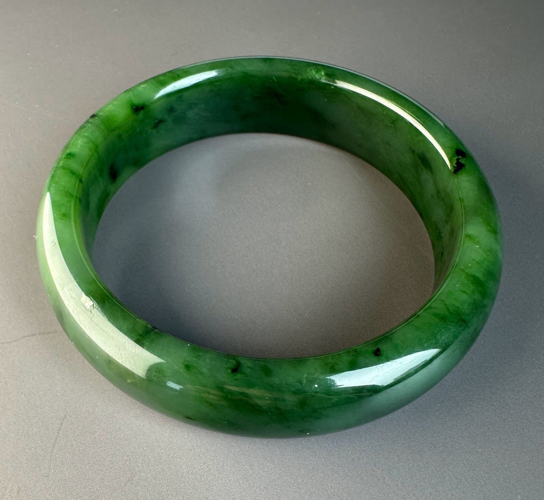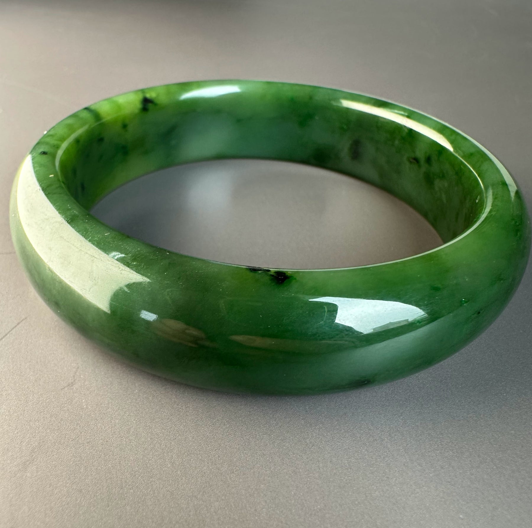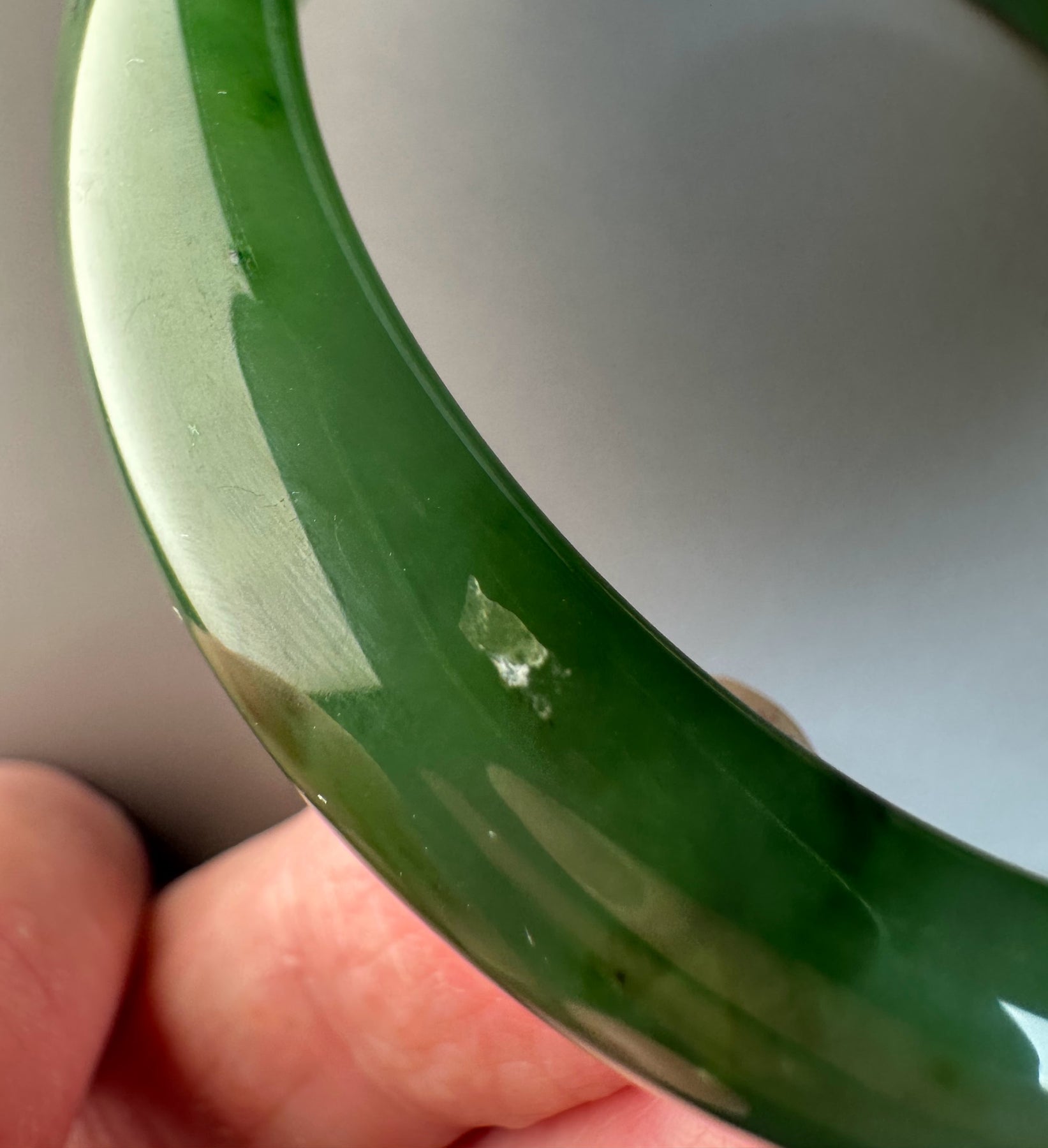 This authentic Canadian Nephrite Jade bangle showcases the natural beauty of jade sourced from Northern British Columbia, near our Kutcho Creek Deposit. Measuring approximately 58 x 15.5mm, this A Grade piece features the rich character and durability jade is known for. Please note this bangle has a small chip that doesn't compromise its structural integrity—it's offered AS-IS