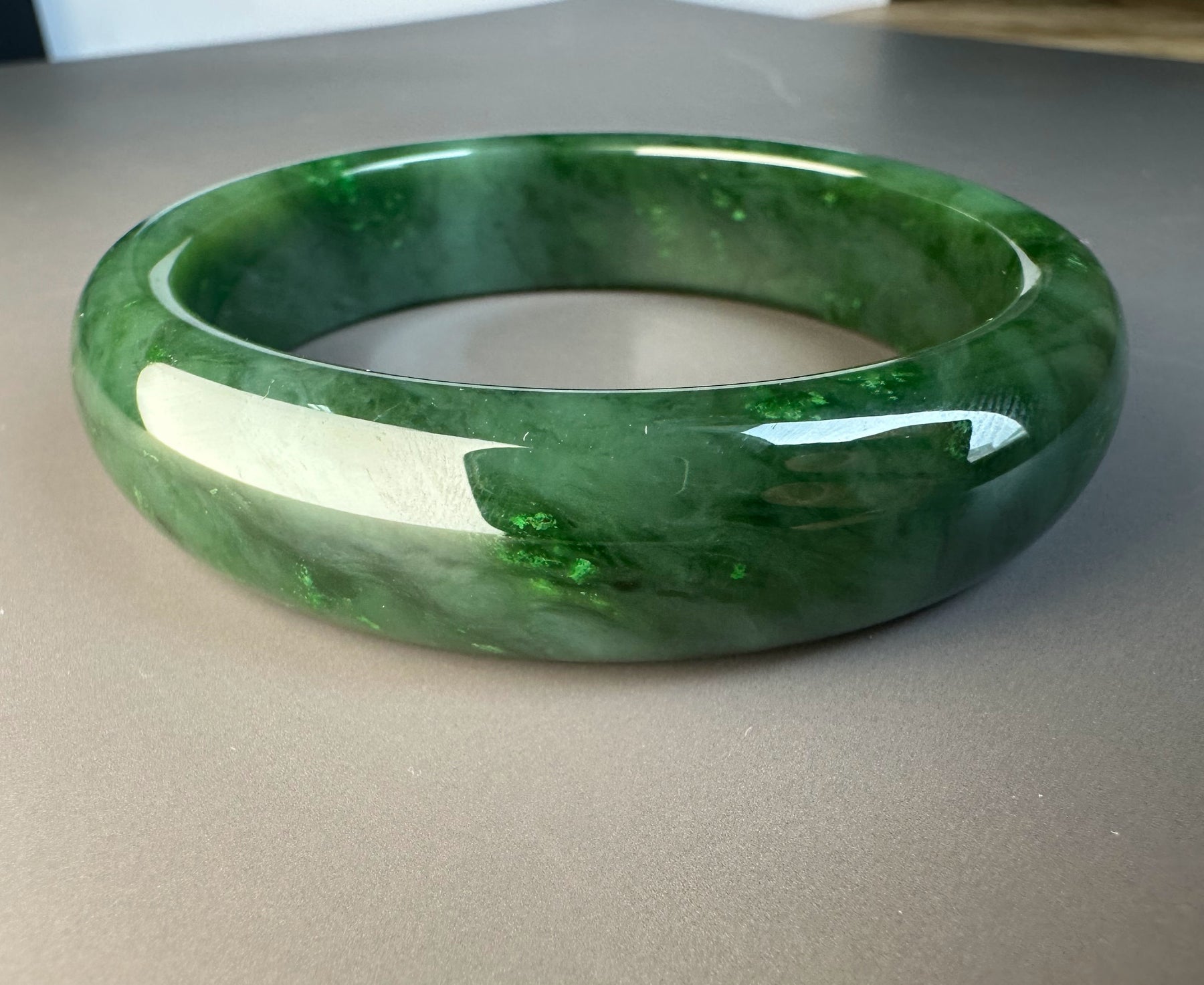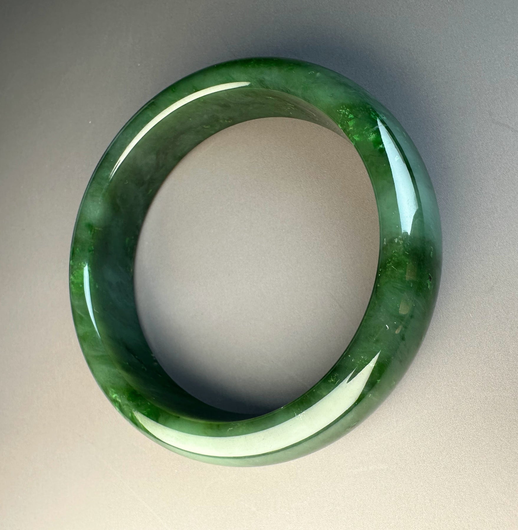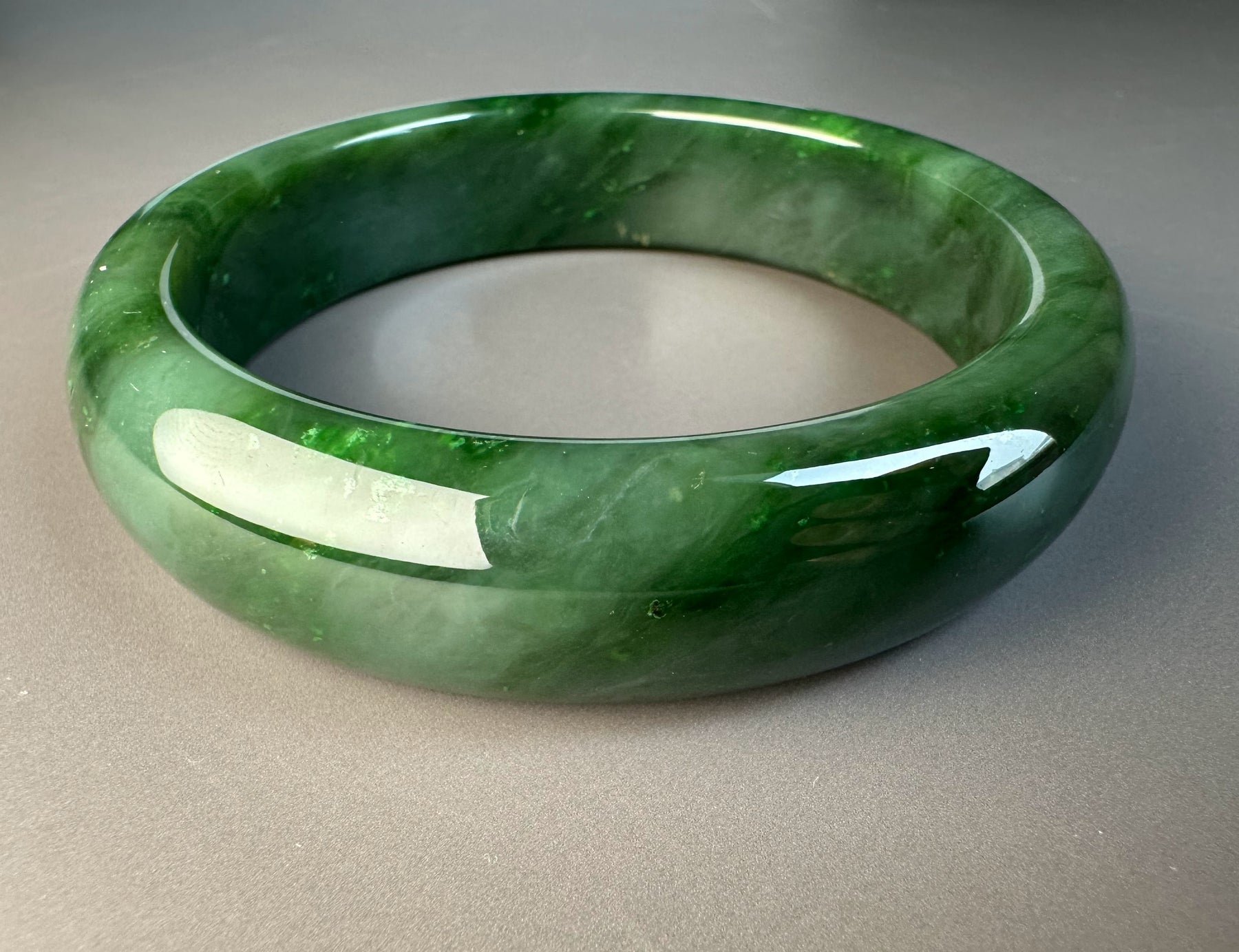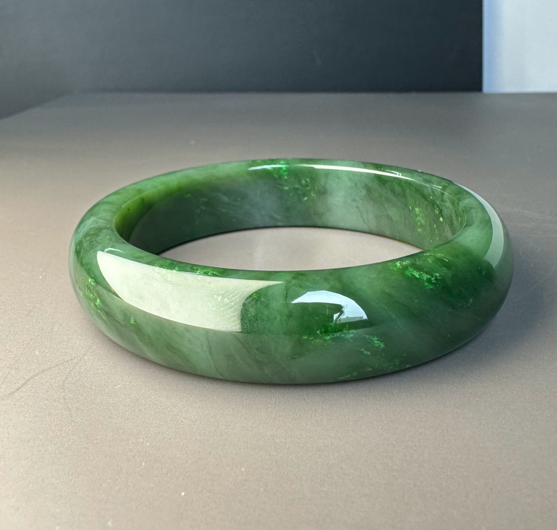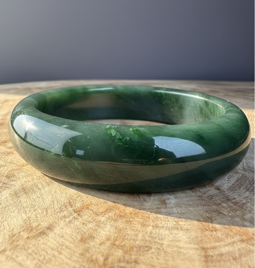 This authentic Dark Green Canadian Nephrite Jade bangle showcases the natural beauty of jade sourced from Northern British Columbia, near our Kutcho Creek Deposit. Measuring approximately 60 x 16mm, this A Grade piece features the rich character and durability jade is known for.