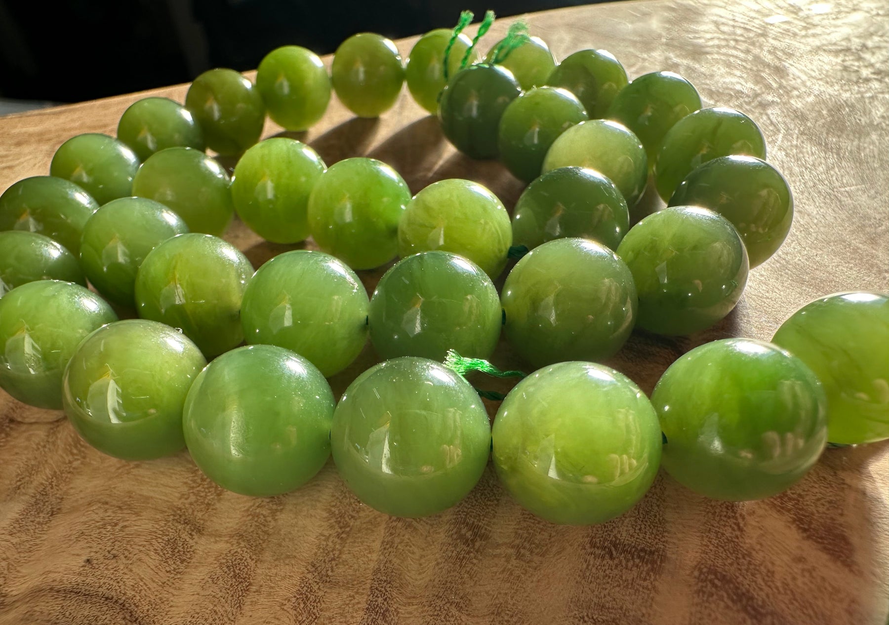 A Grade Light Green Canadian Nephrite Jade Beads, from the Cassiar Mine, lacking many black spots, but have slight milky brown areas around some internal flaws.