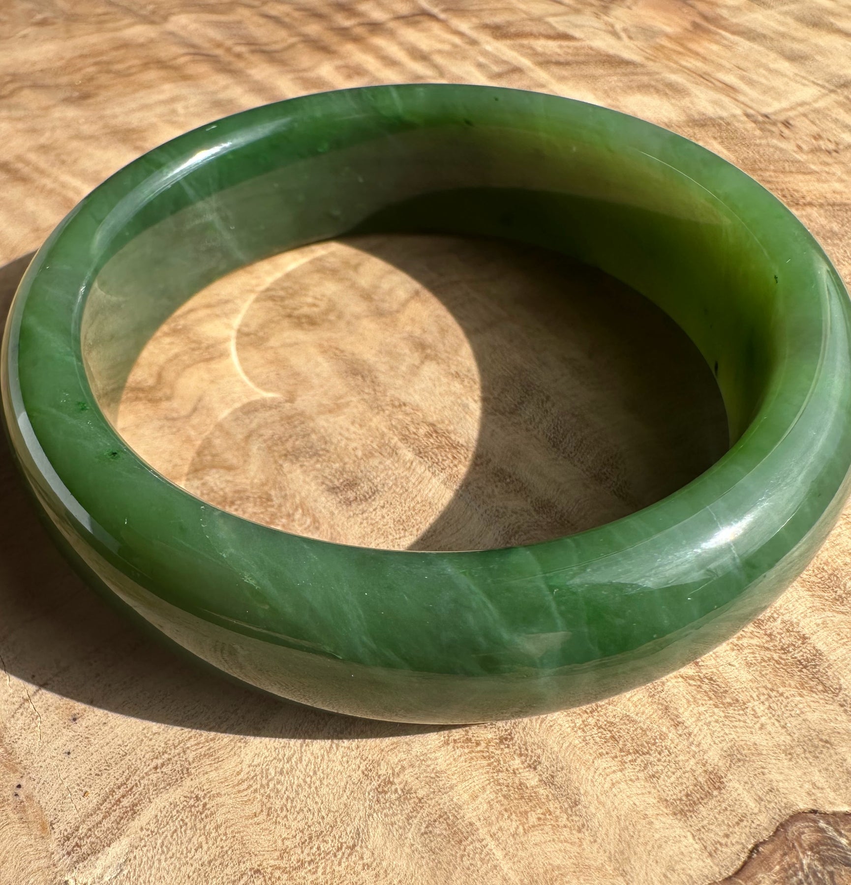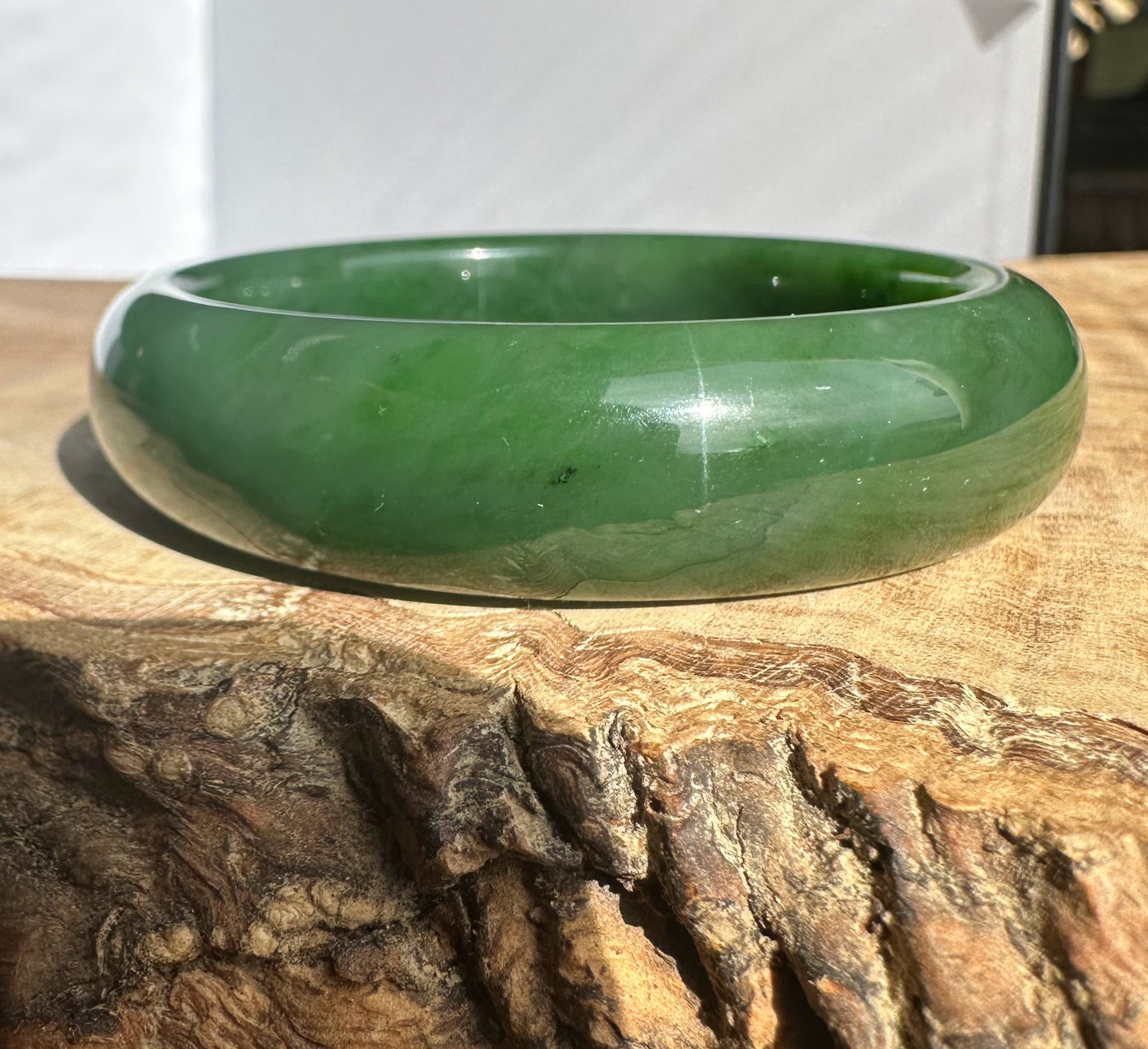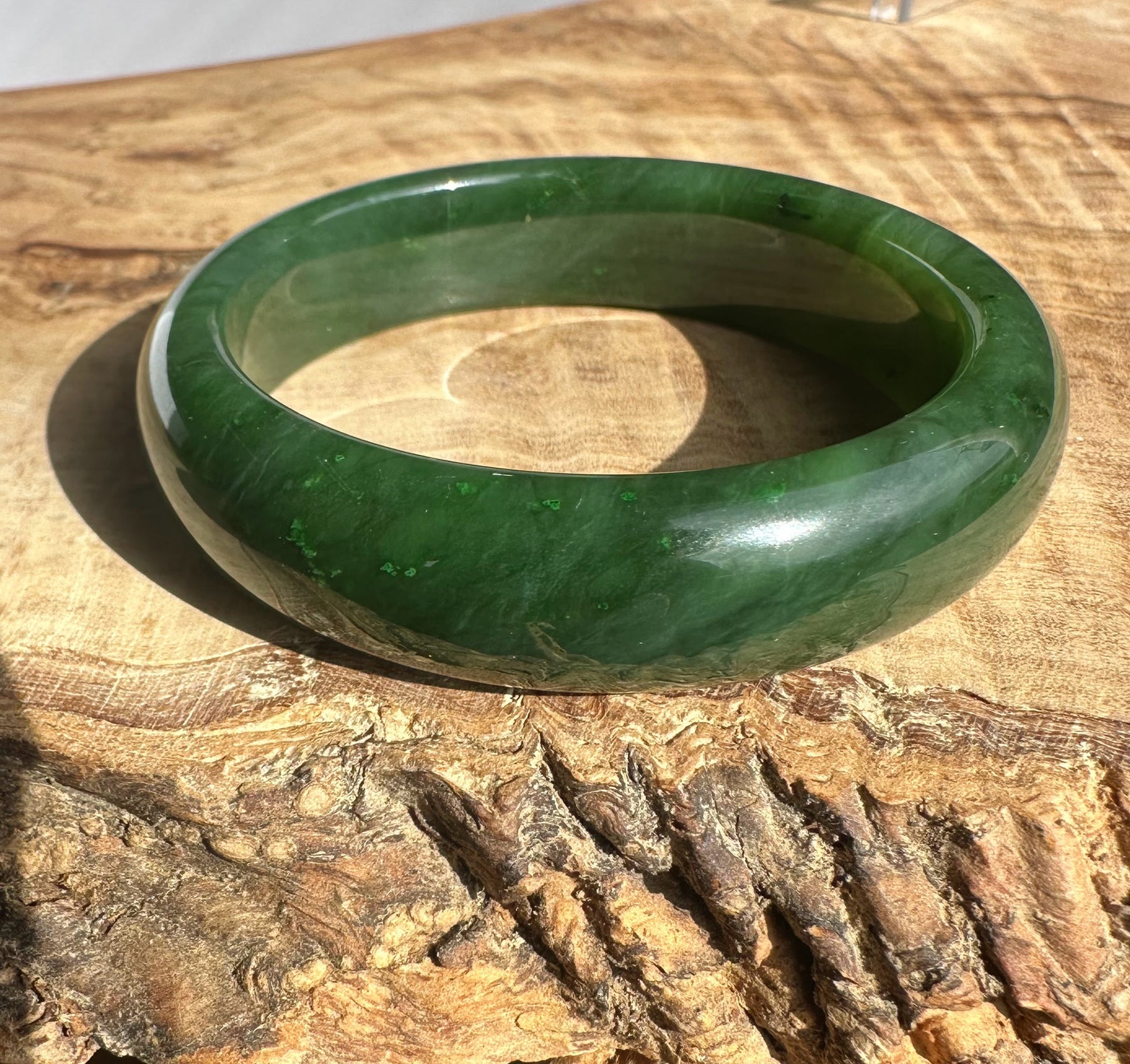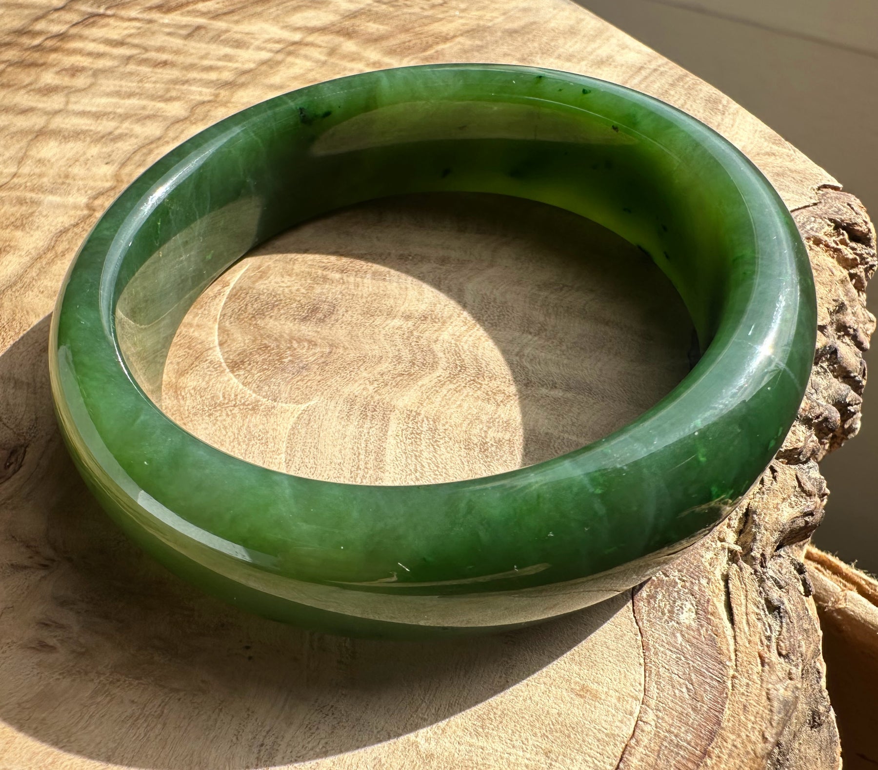 This authentic Canadian Nephrite Jade bangle showcases the natural beauty of jade sourced from Northern British Columbia, near our Kutcho Creek Deposit. Measuring approximately 54.5 x 15mm, this A Grade piece features the rich character and durability jade is known for. Please note this bangle has some minor internal flaws that don't compromise its structural integrity—it's offered AS-IS