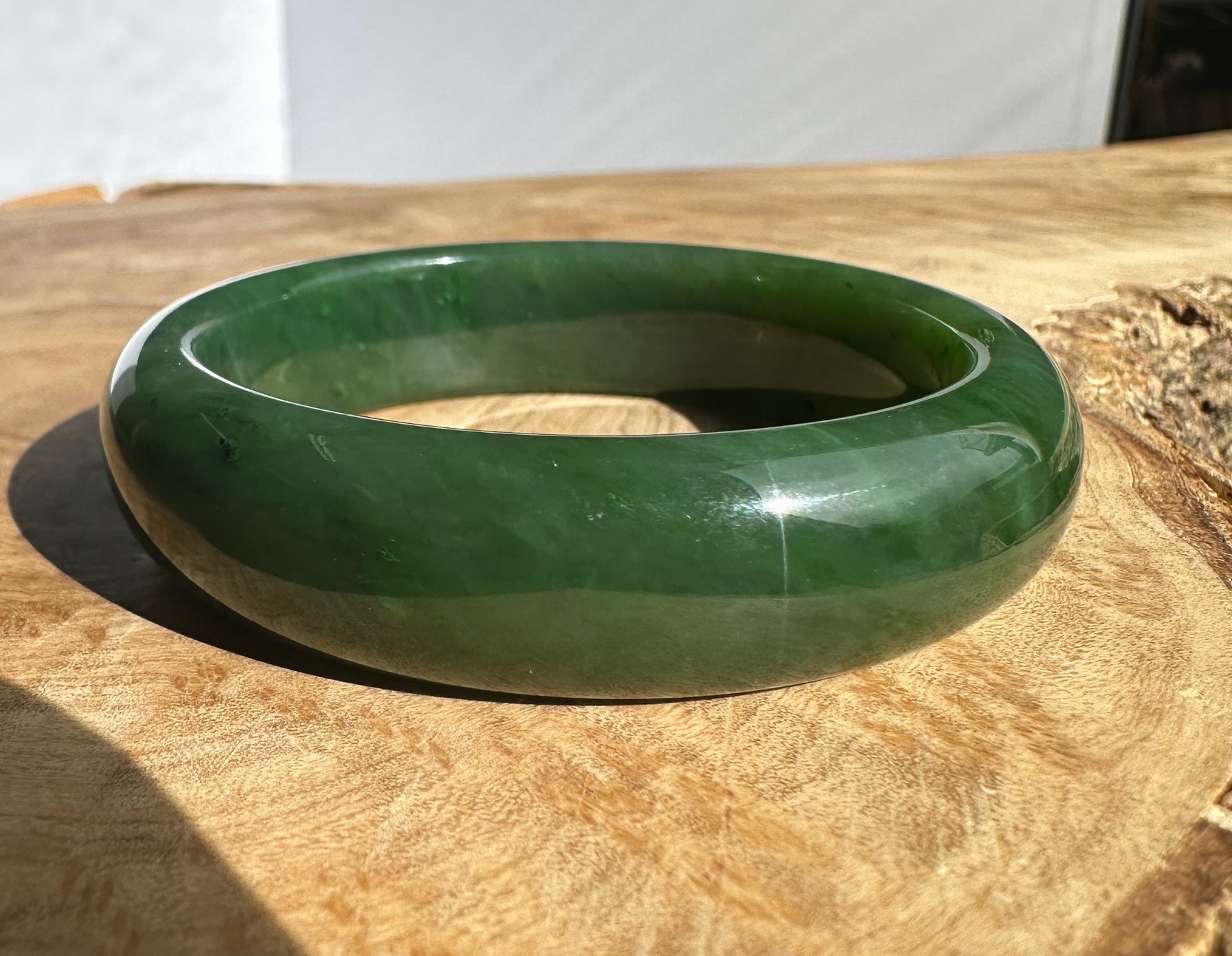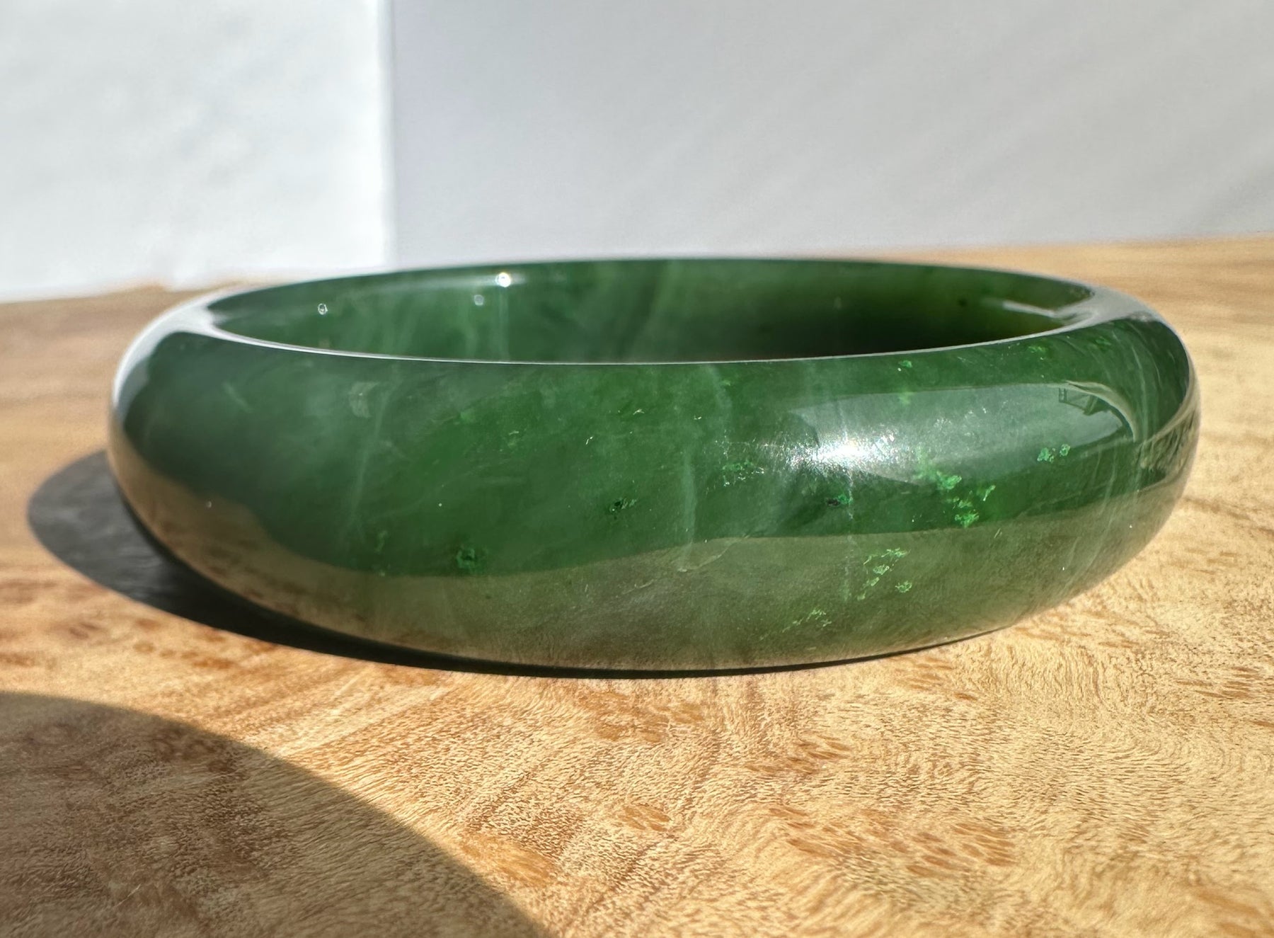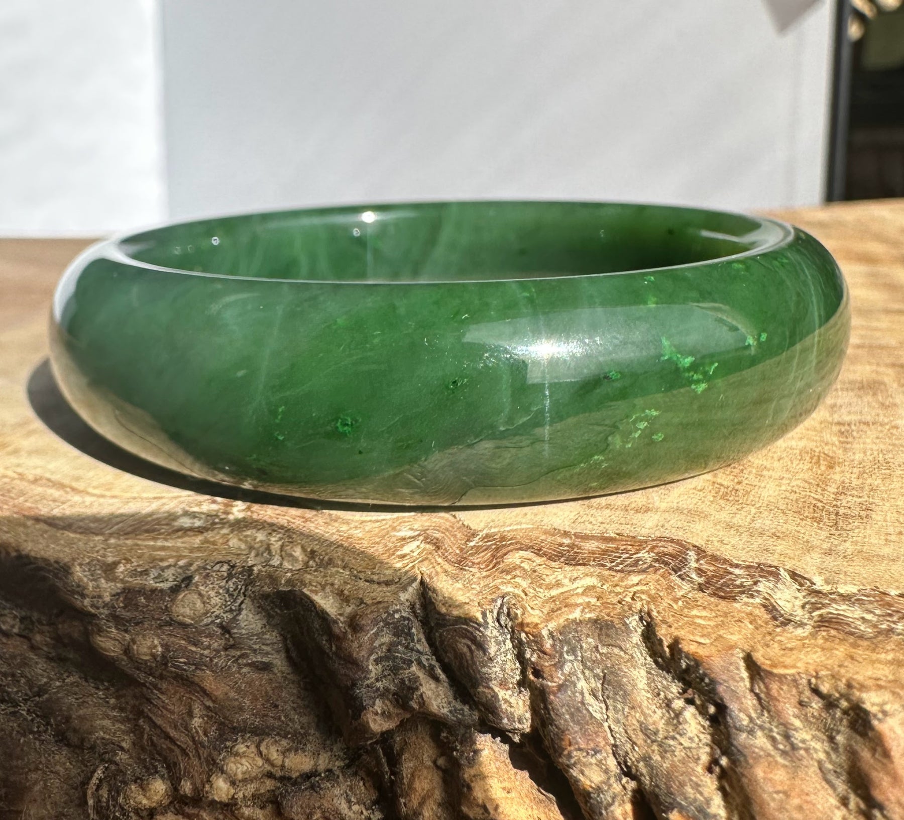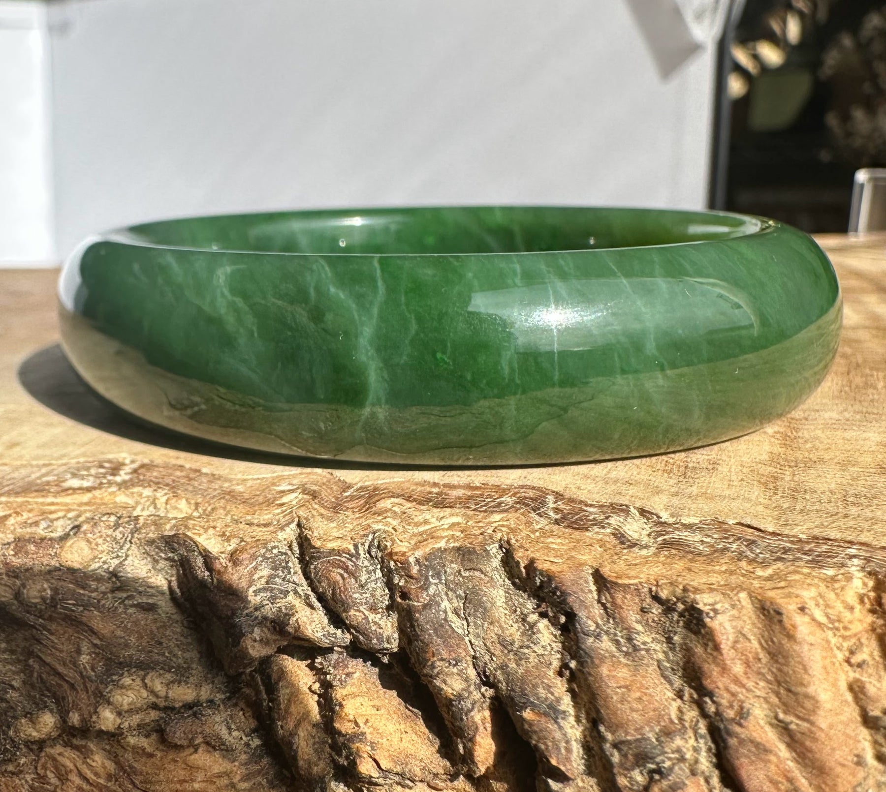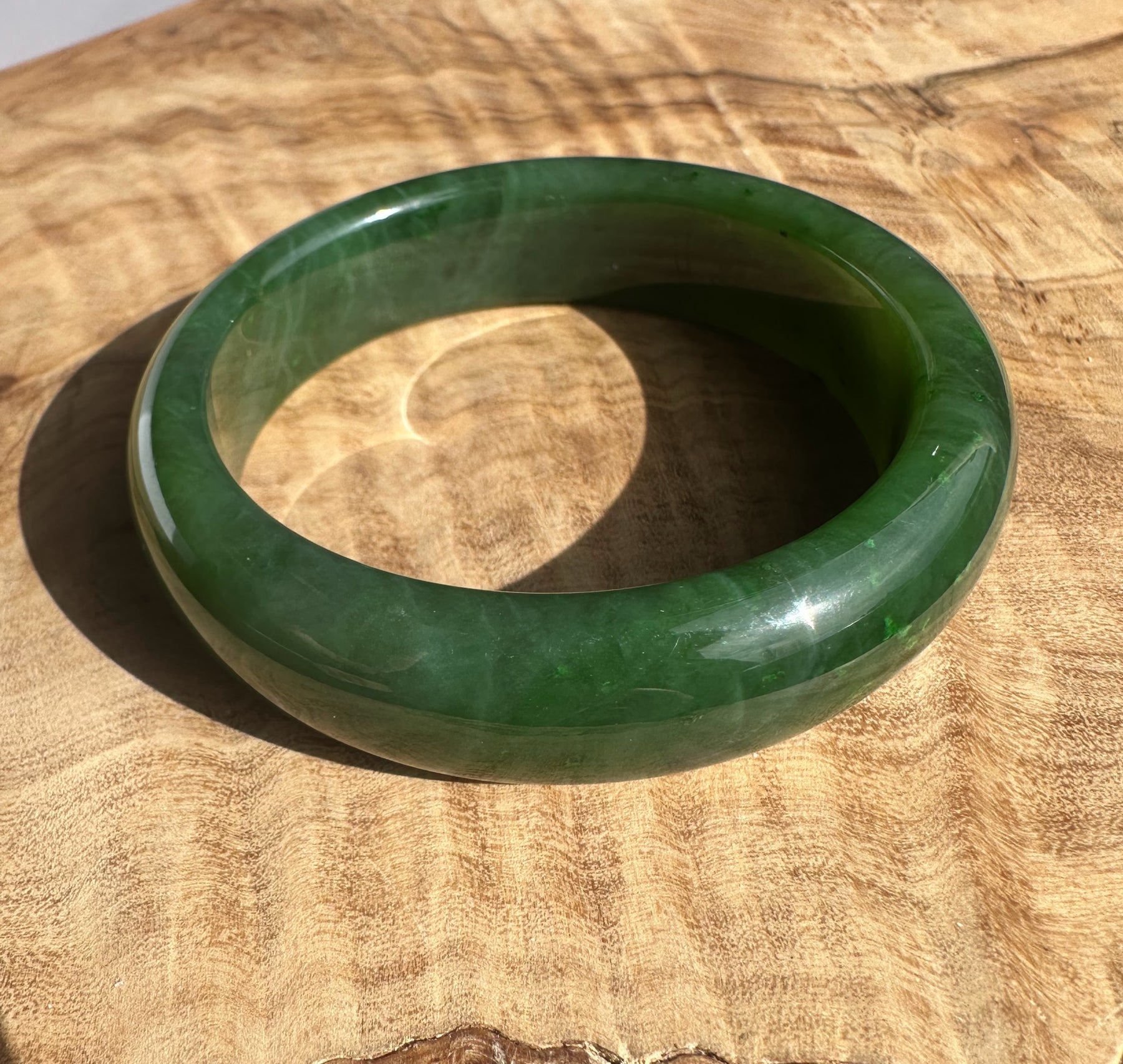 This authentic Canadian Nephrite Jade bangle showcases the natural beauty of jade sourced from Northern British Columbia, near our Kutcho Creek Deposit. Measuring approximately 54.5 x 15mm, this A Grade piece features the rich character and durability jade is known for. Please note this bangle has some minor internal flaws that don't compromise its structural integrity—it's offered AS-IS