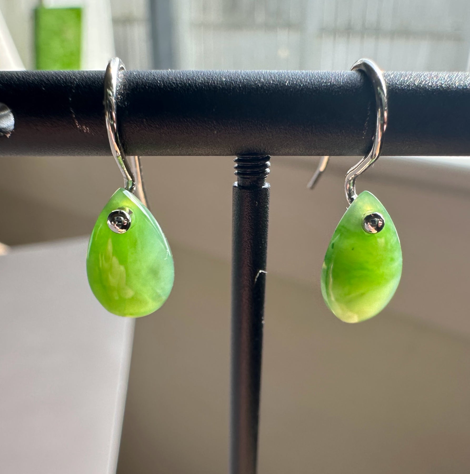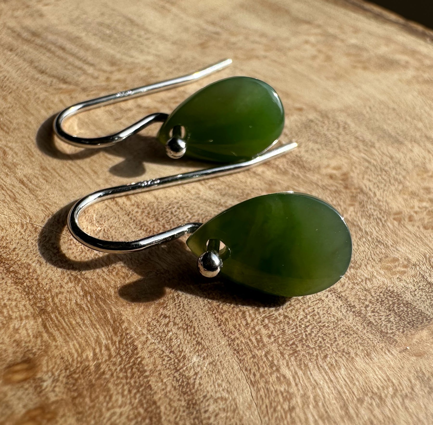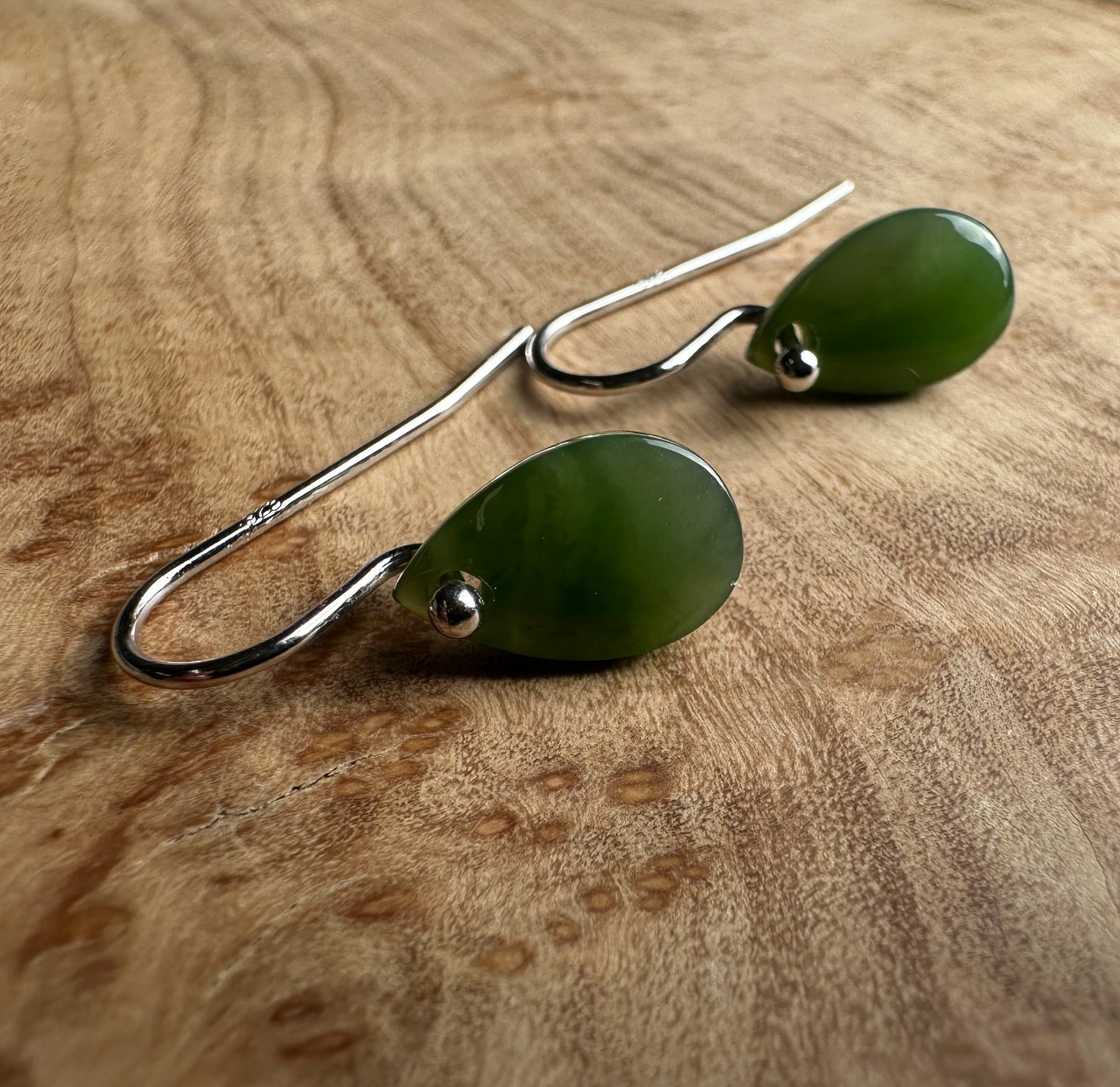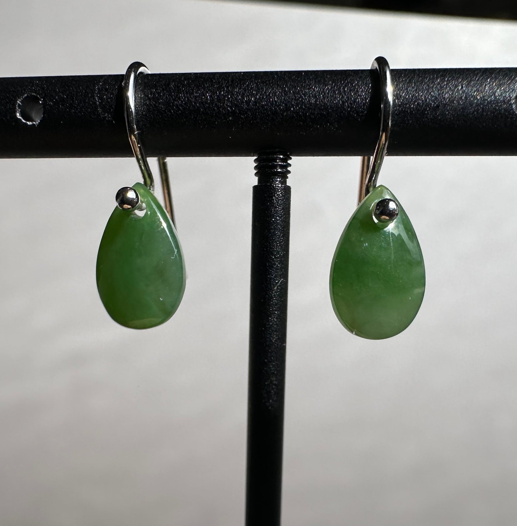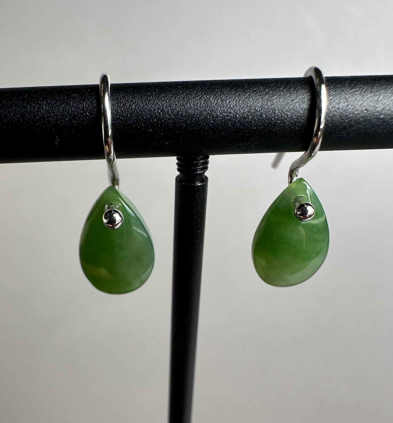 Small Canadian Nephrite Jade Teardrop EarringsSterling silver hooks The jade measures approximately 7x11mm.