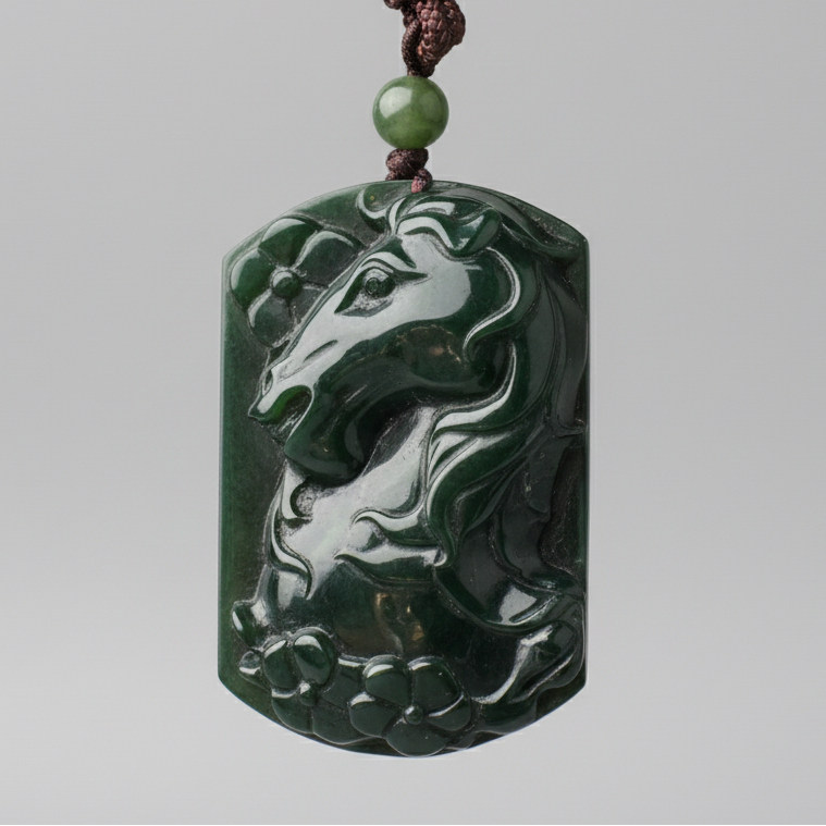 Rich Dark Green/Blue Canadian Nephrite Jade Hand Carved Horse Pendant Has some chips along the sideMeasures approximately 53mm x 35mm Comes on an adjustable brown nylon cord.