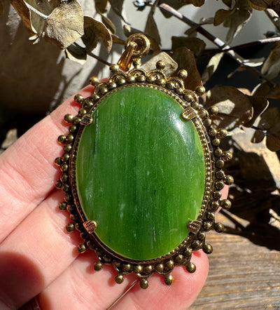 Each one is unique; the jade measures approximately 40x30mm - I believe the metal is brass