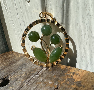 Canadian Nephrite Jade Flower pendant. The jade measures approximately 27.5mm round, gold plate