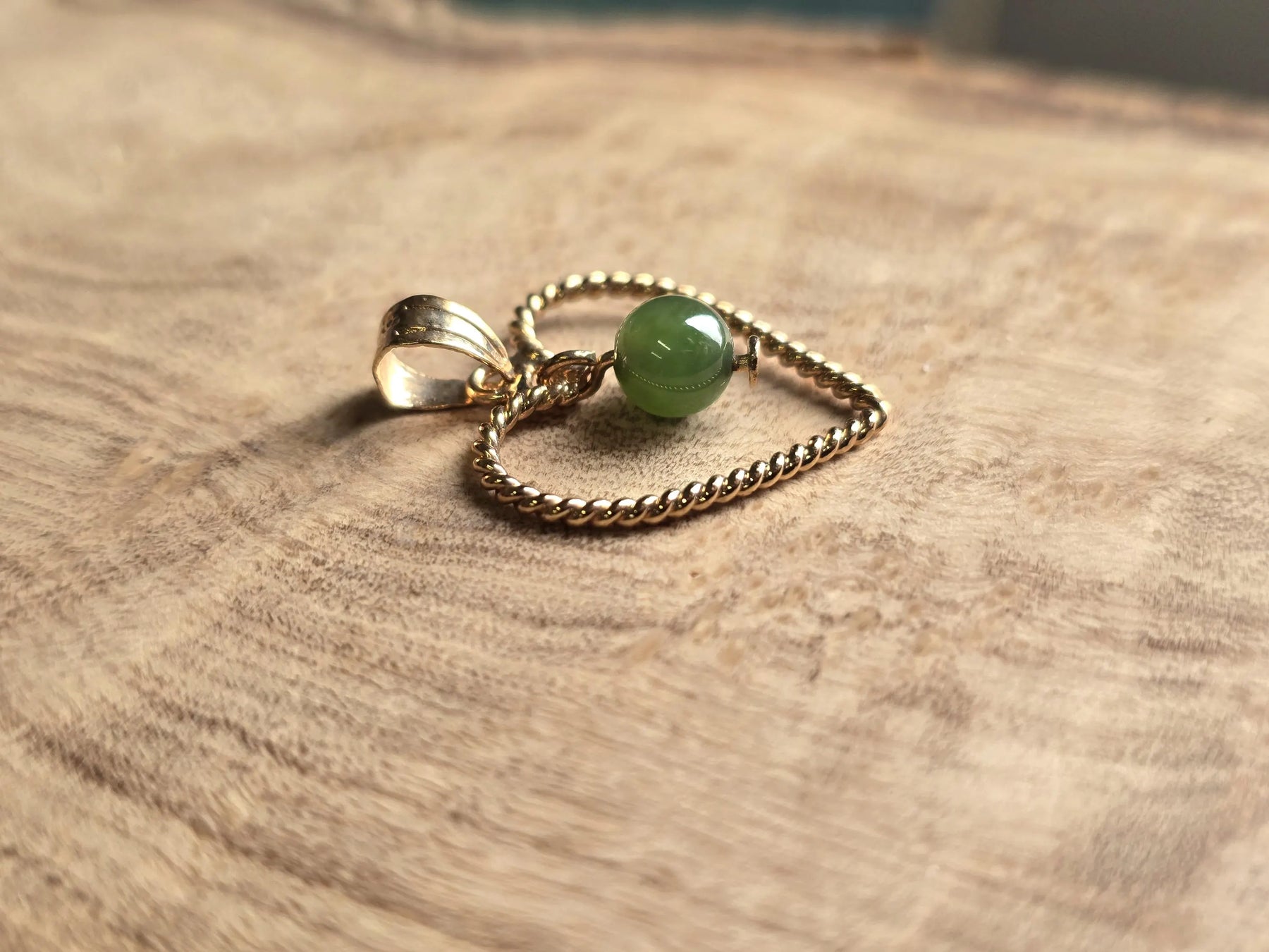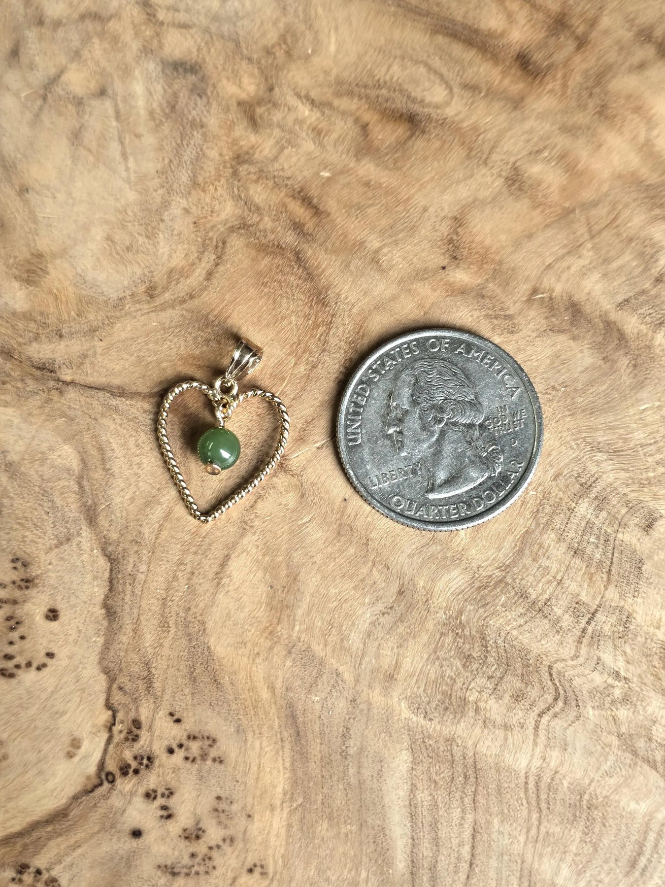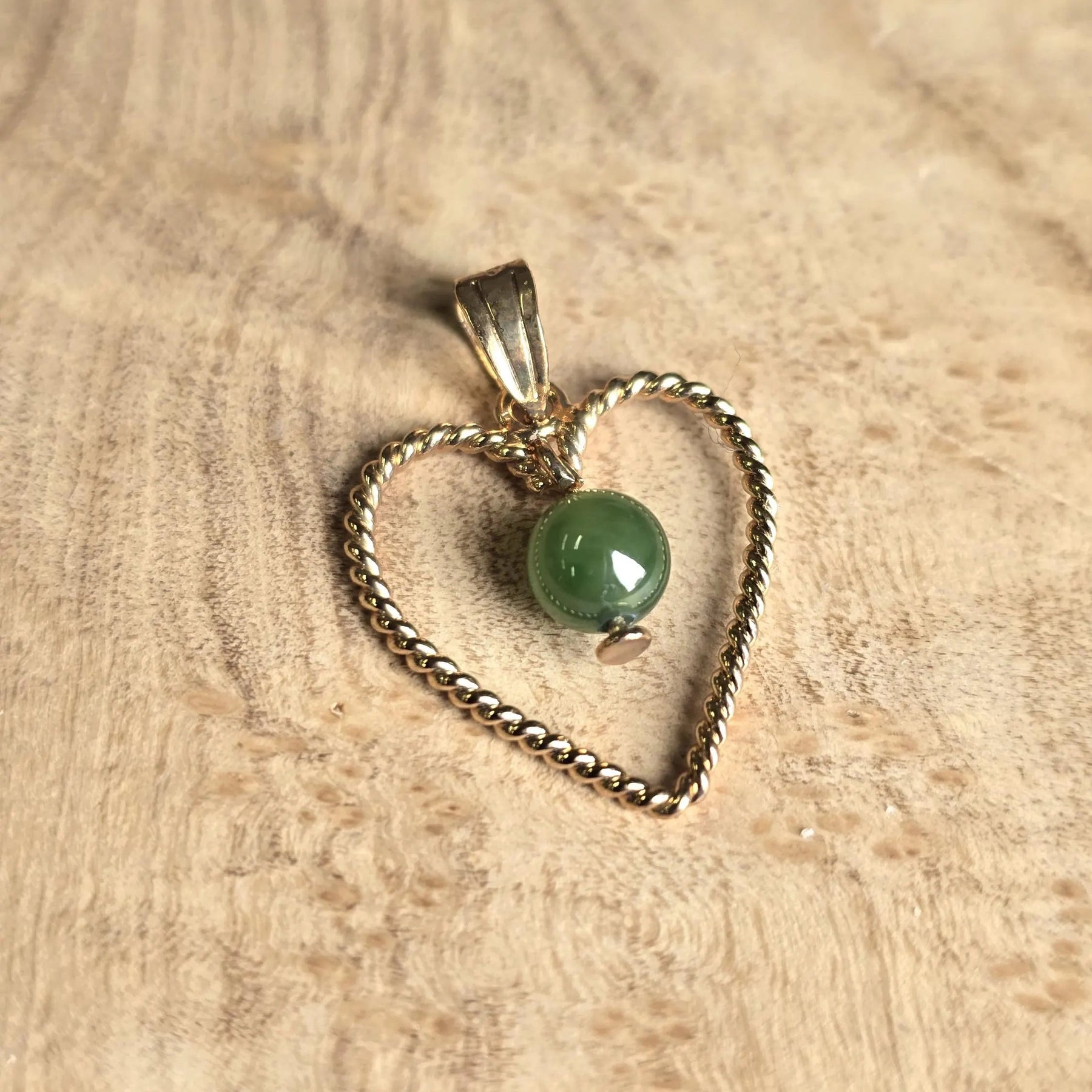 A jade bead dangles inside a gold-tone heart frame. Bead measures approximately 5mm.