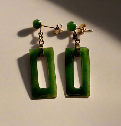 Jade drop earrings measure approximately 30mm and may have small chips along the edges of the jade. They come with or without our handcrafted wooden gift box.